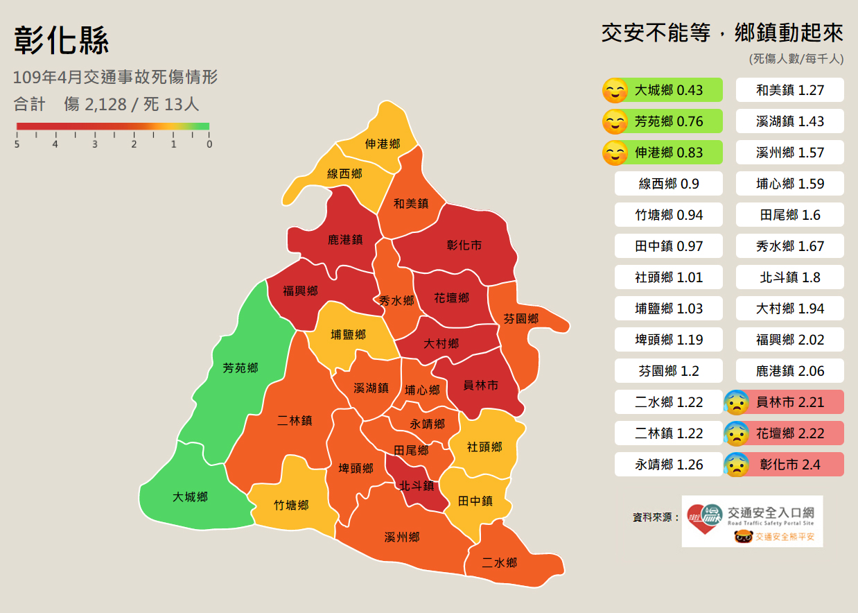 (一)本縣109年4月份交通事故死傷情形,合計:傷 2,128 / 死 13人,珍愛生命,請遵守交通規則。
