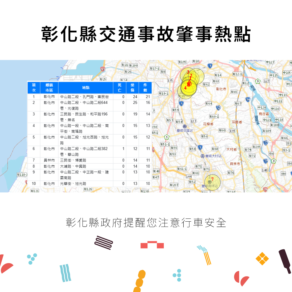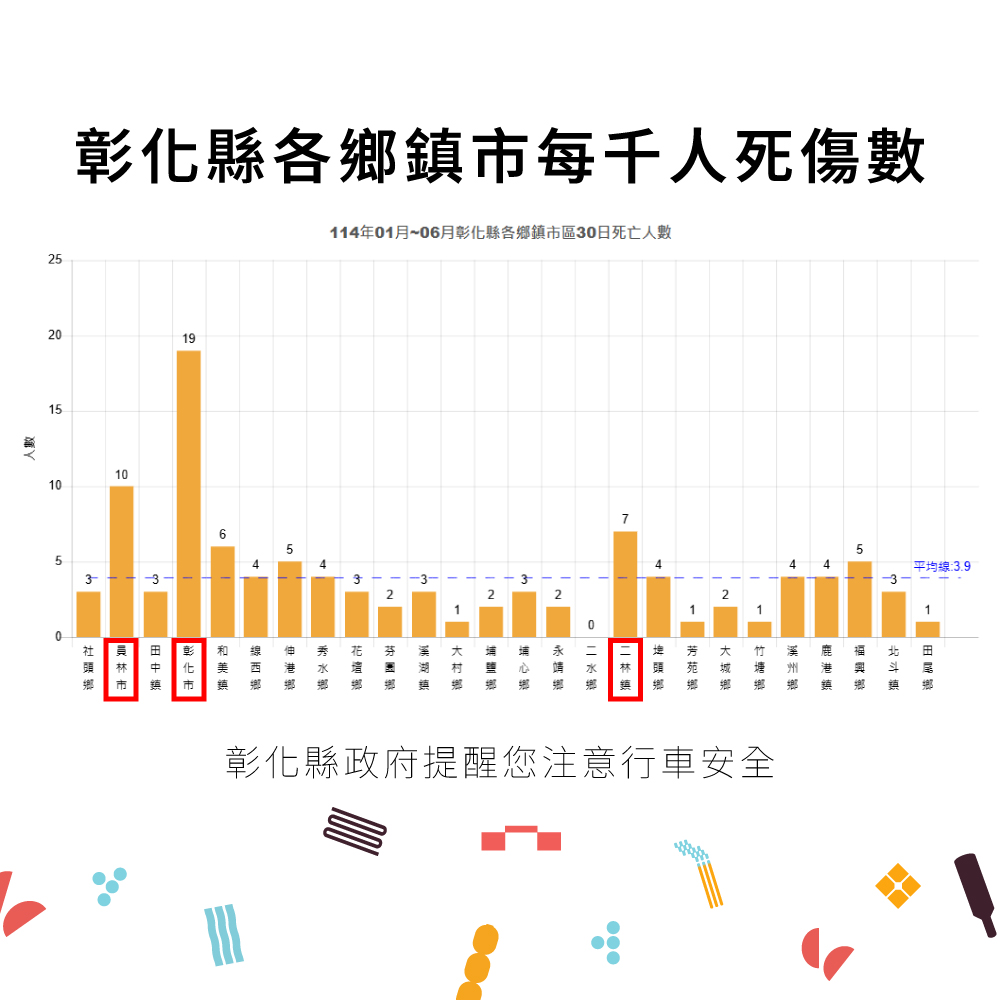 二、 根據交通部道安資訊查詢網統計快覽數據跟112年同期比較分析,以少年自行車騎士(含電自、電輔) 事故增加47.7%最高,外籍人士事故增加38.6%次之,自小客車駕駛人增加25.4%再次之。1-6月份30日鄉鎮市每千人死傷人數於「彰化市、員林市、二林鎮」為多,肇事熱點以「彰化市」為多,合先敘明。