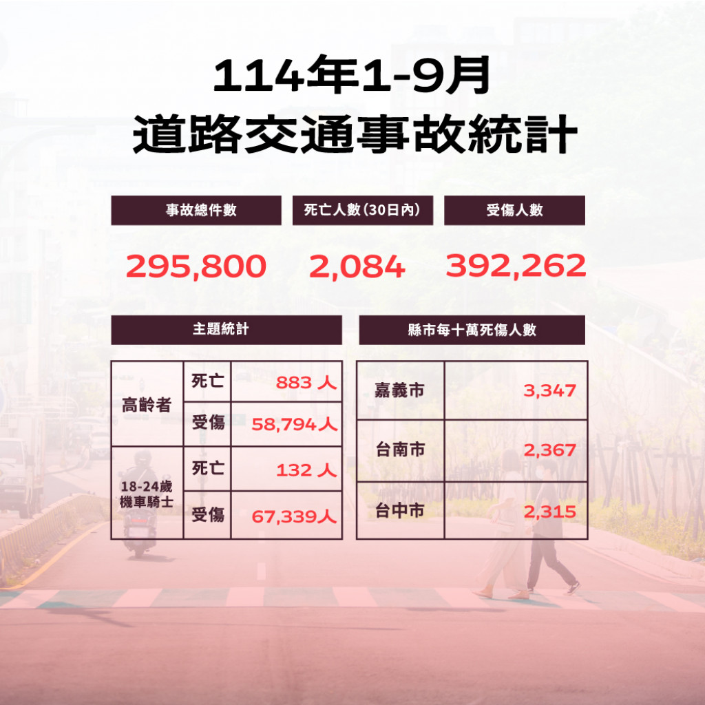 轉知:本縣114年1-9月道路交通事故死傷累計23,418人