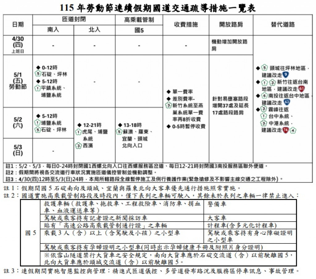 依交通部高速公路局公布之「115年勞動節連續假期國道交通疏導措施一覽表」,提醒民眾於連假期間提早規劃行程,並配合相關交通疏導措施,以維護行車安全與順暢。