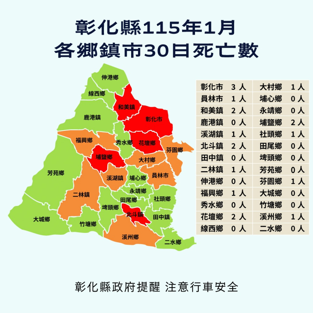 | 二、 | 根據交通部道安資訊查詢網,本縣115年1月道路交通事故與去(114)年同期比較分析,以大型車造成行人涉入事故增加100%最高,少年自行車騎士(含電自、電輔) 增加67.4 %次之。微型電動二輪車(含電輔) 增加48.8 %再次之。1月份鄉鎮市30日死亡人數於「彰化市、和美鎮、北斗鎮、花壇鄉、埔鹽鄉」為多,肇事熱點以「彰化市」為多,合先敘明。 |
